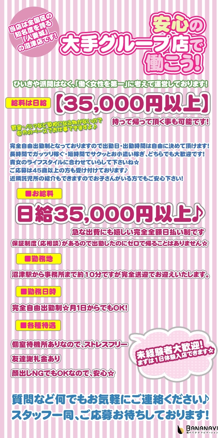 素人人妻との密会は、恋人気分、不倫気分で独特な背徳感を味わっていただけます。 基本サービス全て無料の高サービス! 人妻城はロングタイムでお楽しみください。 沼津人妻城はで通常のプレイで物足りない方にも、 様々なオプションも無料でご用意しておりますので、 高サービスの沼津人妻城は是非ロングタイムでお楽しみください。 ============ 静岡県公安委員会 新風営法届出済み優良店 ============