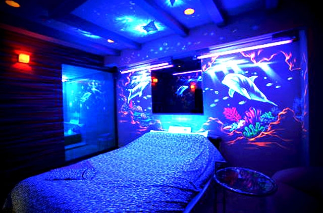 | ブラックライトバスタブ | 全てのお部屋に、雰囲気たっぷりなブラックライト使用のバスタブをご用意。 |