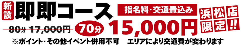 | 合流してからのスタートです。 【指名料】 新規指名 2,000円 リピート指名 2,000円 【交通費】 浜松市内 1,000円~ ※エリアによって異なりますのでお問合せ下さい。 ▼出張エリア 静岡県(西部・中部)愛知県(東三河)の 各駅でお待ち合わせ&ホテル直接。 ※ご予約は二週間前から承っております。 ※ご予約して頂いた女性とはメッセージ交換が無料となります。 | |