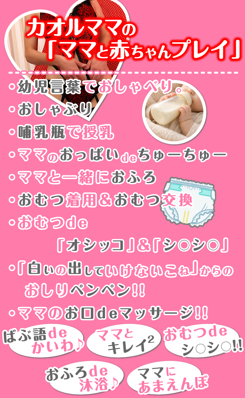 | 『プレイ内容』 (無制限発射) お客様に紙オムツをしておしゃぶりをくわえて頂き、赤ん坊として接します。ママは赤ちゃんをあやすように幼児言葉で話しかけ、お客様は赤ん坊として振舞って頂きます。コミュニケーションは赤ちゃん言葉で行って頂きます。 ママは入浴後エプロンを付けて僕ちゃんをあやしてくれます。 ママと入浴・ハミガキ・パウダーマッサージ・紙オムツを付けたままのオシッコ・オムツ交換・耳かき・ママのオッパイちゅうちゅう・ままのおひざでおしりペンペン・オムツを付けたまま手コキ、生フェラ・哺乳瓶で飲ませてもらう(カルピスetc)・Dキス・乳首舐め・ママにイタズラ(おさわり)・69・アナル舐め・前立腺マッサージ、指入れ・パイズリ・快楽素股・お口に発射 ※その他のお遊び希望の方はお気軽にお問合せくださいネ! ※女性によって出来ないプレイもございますのでご了承ください ▼ オプション ままのパンスト持ち帰り:¥1,000 ママのパンツ持ち帰り:¥2,000 聖水:¥3,000 ※90分以上のコースでガーゼ亀頭責め、またはストッキング亀頭責め無料サービス | |