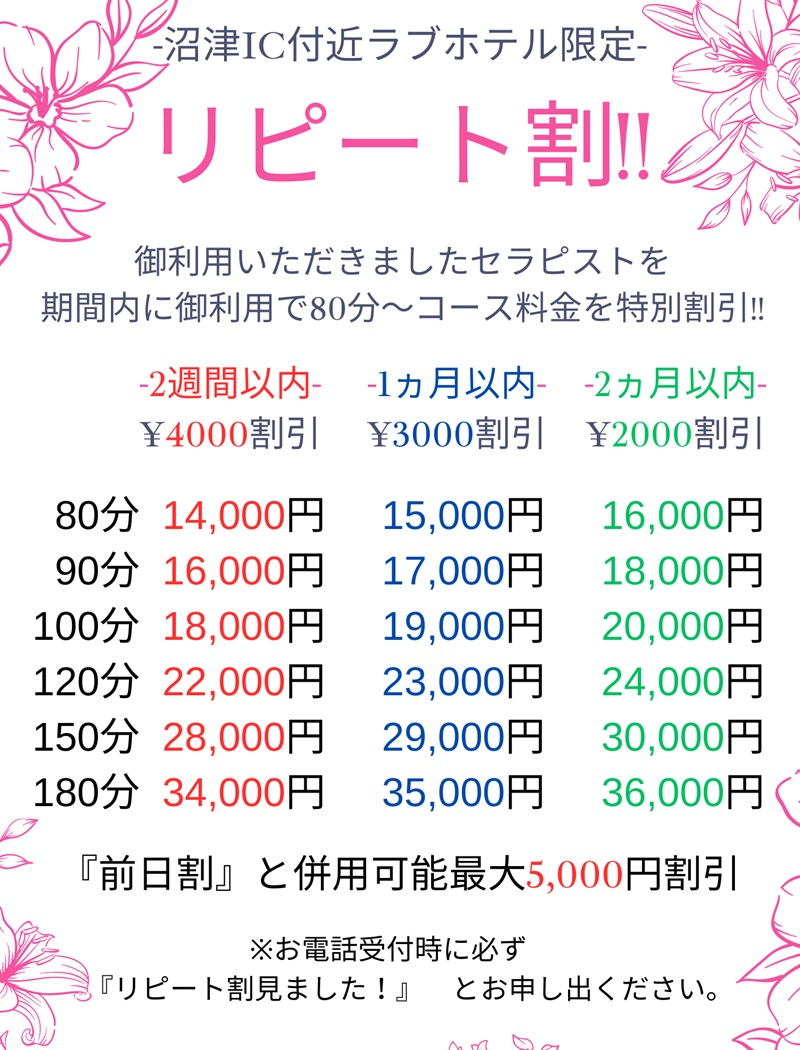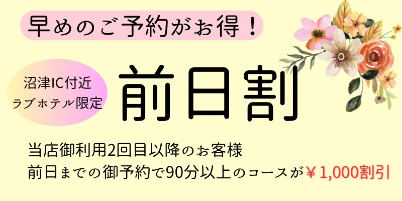 前日までに、ご予約いただくリピーター様、沼津IC付近ラブホテル限定